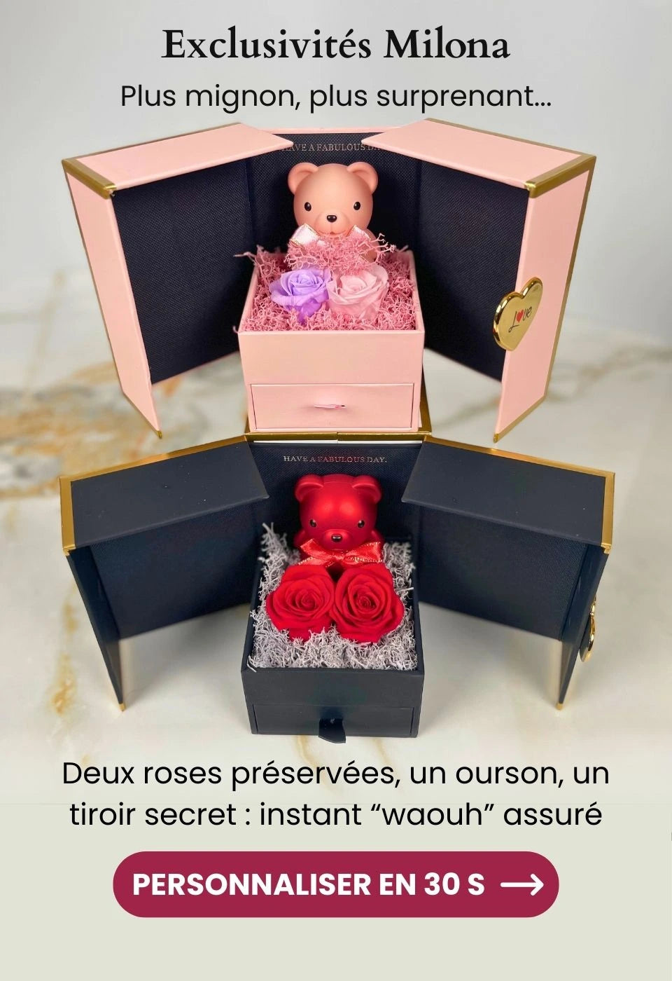 Explorez notre collection de coffrets cadeaux faits de vraies roses éternelles.