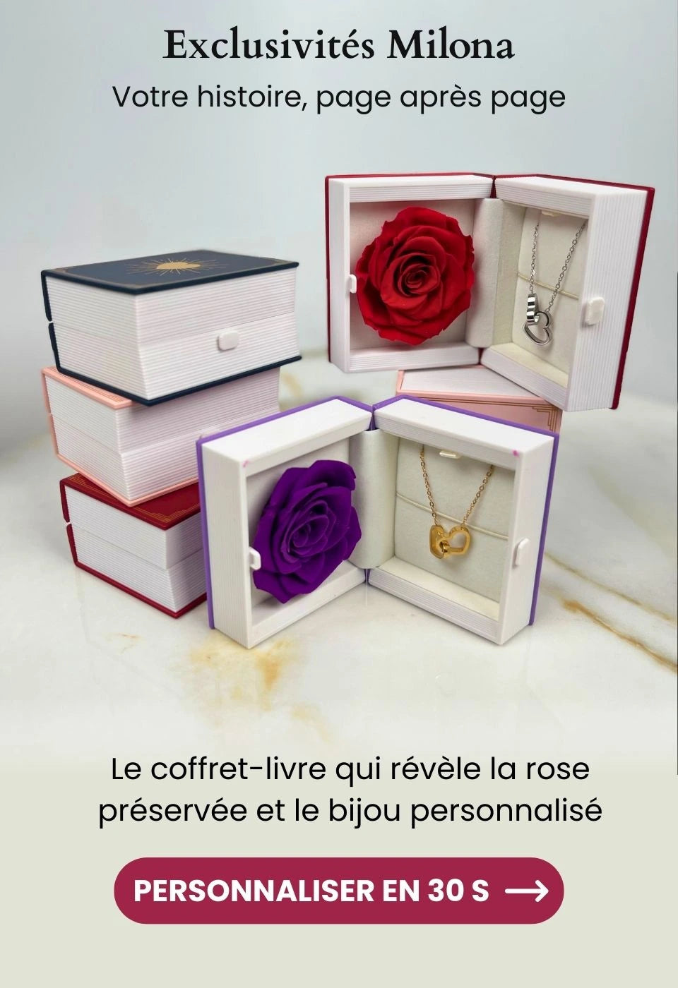 Tous nos bijoux peuvent être ajoutés au panier avec un coffret rose éternelle de votre choix.