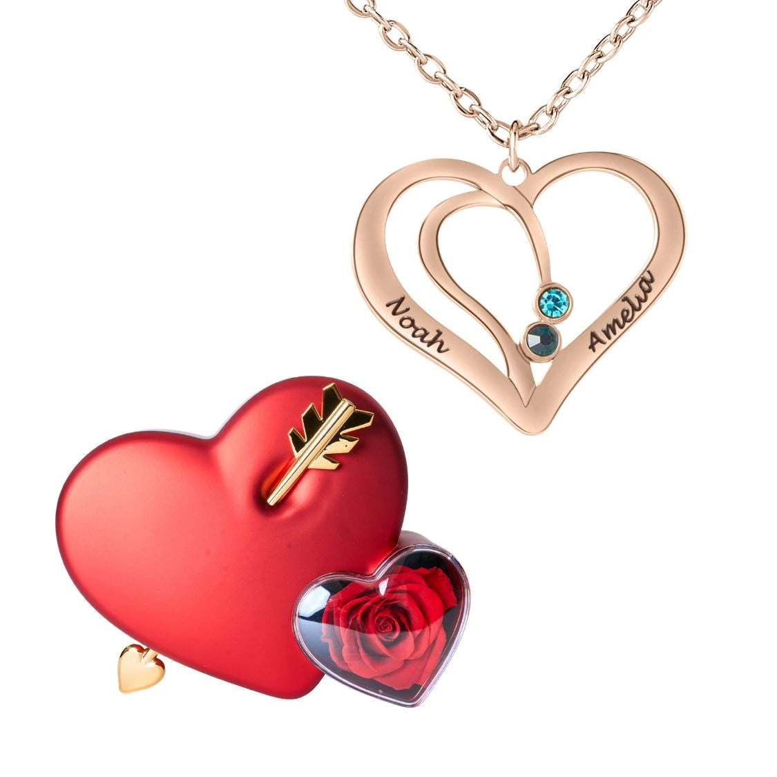 Coffret Amour Éternel & Collier Cœur Entrelacé avec Prénoms Gravés et Pierres de Naissance